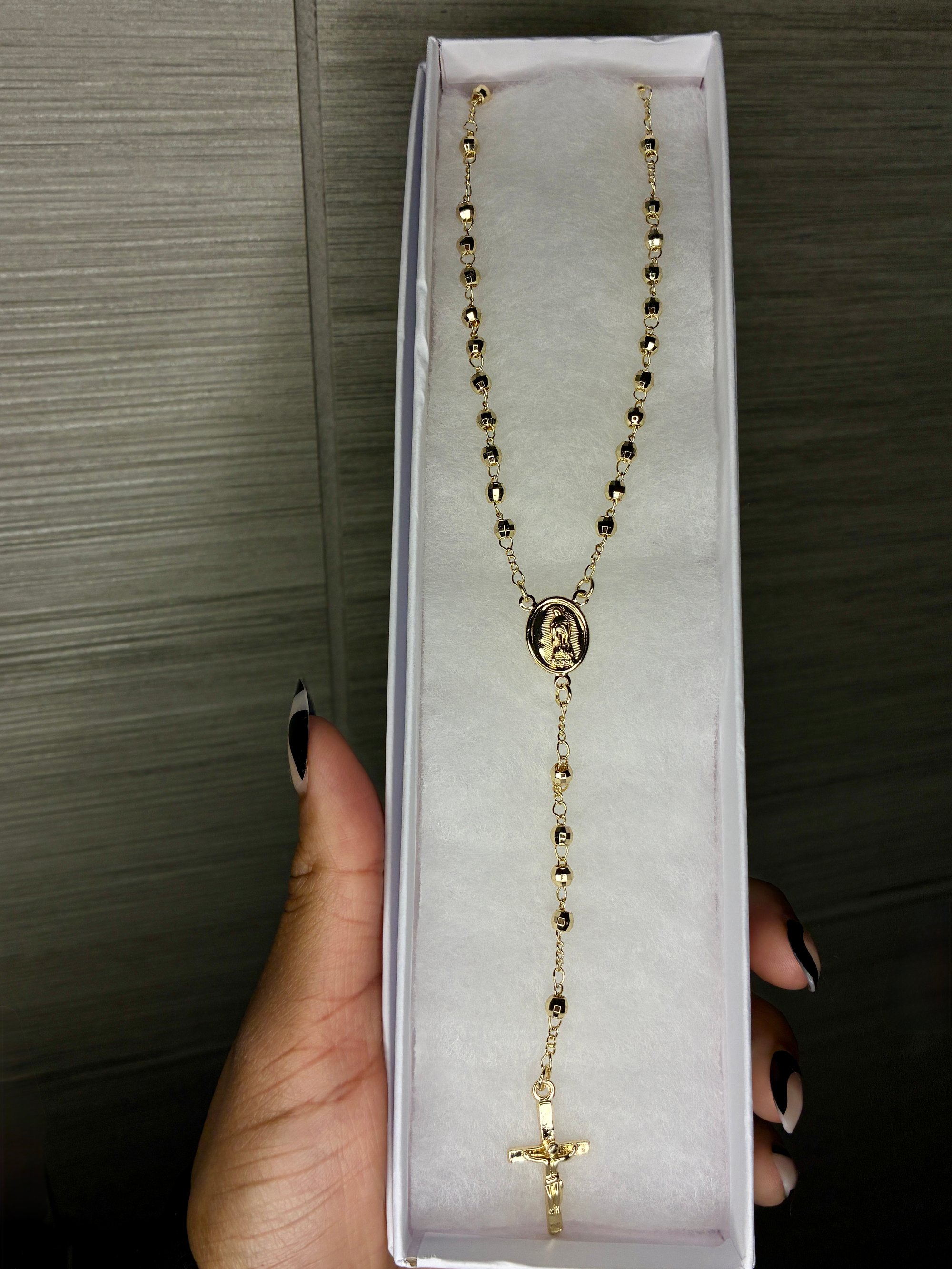 A golden rosary chain that sparkles with every move ✨